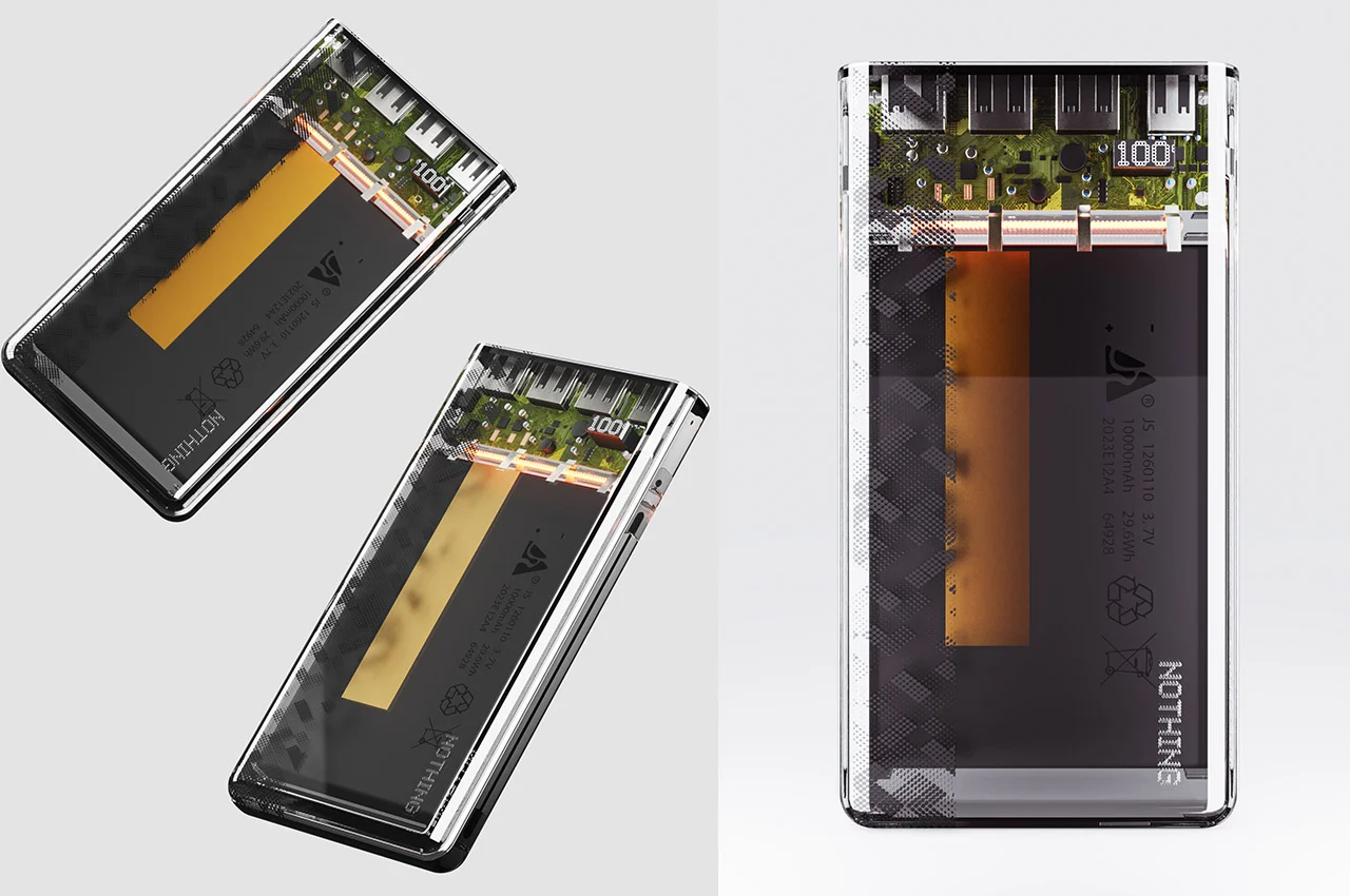 Nothing 보조 배터리라고 불리는 이 작은 장치는 여행 모험을 위한 완벽한 동반자입니다. 내부의 영광과 아름다움을 아름답게 드러내는 투명한 미학을 가지고 있습니다. 내부 요소는 작고 따뜻한 톤의 LED로 조명되어 작은 액세서리의 안팎이 사이버펑크적인 느낌을 줍니다.