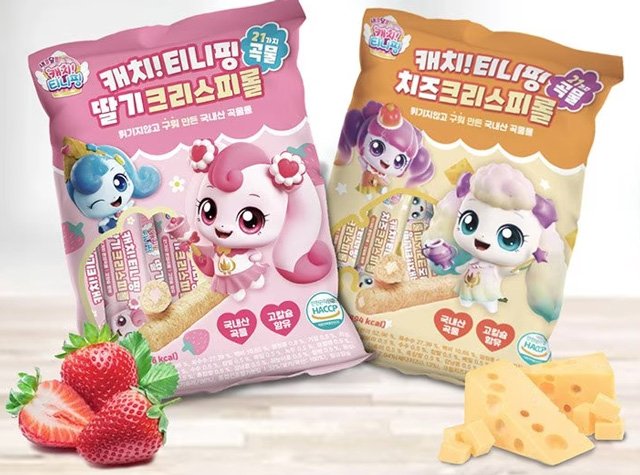 우리나라의 유소년층으로부터 절대적인 지지를 받는 캐치 티니핑 IP로 출시된 딸기 과자도 찾아볼 수 있다. 21종의 국내산 곡물(현미, 옥수수, 백미, 검정콩, 메밀, 녹두, 검정깨, 팥 등)을 혼합해 만든 영양가 높은 크리스피 제품이다. 기름에 튀기지 않고 구워서 만들어, 트랜스지방 걱정을 하지 않으면서 바삭한 식감을 즐길 수 있다. 상큼한 딸기맛과 고소한 치즈맛을 선택할 수 있다. 가격은 13,900원이다.