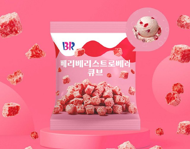 아이스크림 전문 프랜차이즈인 배스킨라빈스의 이름이 편의점 등지에서 많이 보이고 있다. 콜라보를 통해 영역을 확장해나가는 배스킨라빈스의 신제품으로 딸기 과자인 ‘베리베리스트로베리 큐브’가 출시됐다. 배스킨라빈스의 인기 아이스크림인 베리베리스트로베리를 큐브 모양의 스낵으로 구현했다. 국내산 딸기 퓌레를 사용해 진한 딸기의 맛과 먹기 편한 사이즈의 과자로 완성했다. 본 제품의 편의점 기준 판매가는 2,000원이다.