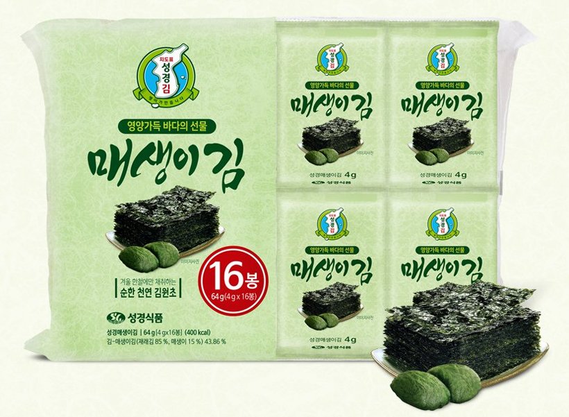 매생이는 바다 내음이 굉장히 진해서, 한입 삼키면 진한 바다의 풍미를 느낄 수 있는 녹조류다. 김의 풍미를 더하기 위해 일정량의 매생이를 혼합한 것이 ‘매생이김’인데, 지도표 매생이김은 상품화된 것들 중에서도 가장 인기가 좋은 제품으로 꼽힌다. 깨끗한 청정 완도 앞바다에서 자란 매생이를 활용했으며, 순도 95%의 뉴질랜드산 천일염으로 맛을 냈다. 총 32봉 구성 패키지의 온라인 최저가는 14,030원으로 확인된다.