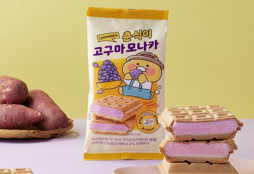 편의점 GS25에서는 카카오프렌즈의 인기 캐릭터 ‘춘식이’를 활용한 모나카 아이스크림을 만날 수 있다. 직관적인 이름의 ‘춘식이 고구마 모나카’가 바로 그것이다. 이름처럼 모나카 과자 사이에 달콤한 고구마의 풍미를 담은 아이스크림을 가득 넣었다. 아이스크림과 모나카 과자 사이에는 고구마 시럽도 발려있어, 달콤하게 즐길 수 있다. 20종의 춘식이 캐릭터의 모습을 담은 띠부씰이 동봉돼 제공된다. 본 제품의 편의점 기준 판매가는 2,500원이다.