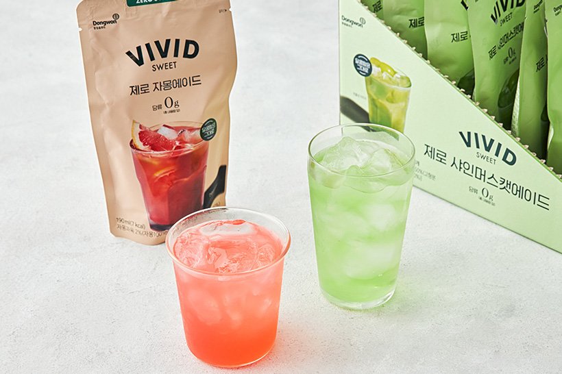 동원홈푸드는 파우치 형태의 제로 탄산음료를 출시해 판매하고 있다. 가볍게 즐기기 좋은 비비드스위트 제로 에이드다. 에리스리톨을 활용해 자연스러운 단맛을 냈으며, 당류가 0g이라 안심하고 즐길 수 있다. 선명한 달콤함이 돋보이는 샤인머스캣맛과 달콤하면서도 쌉싸름한 매력의 자몽맛의 두 가지 종류를 고를 수 있다. 패키지 하나에 10개의 파우치가 담겨 제공된다. 샤인머스캣맛 기준 10개들이 패키지의 판매가는 7,900원이다.